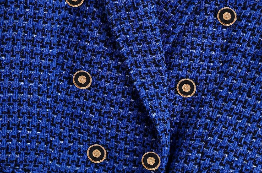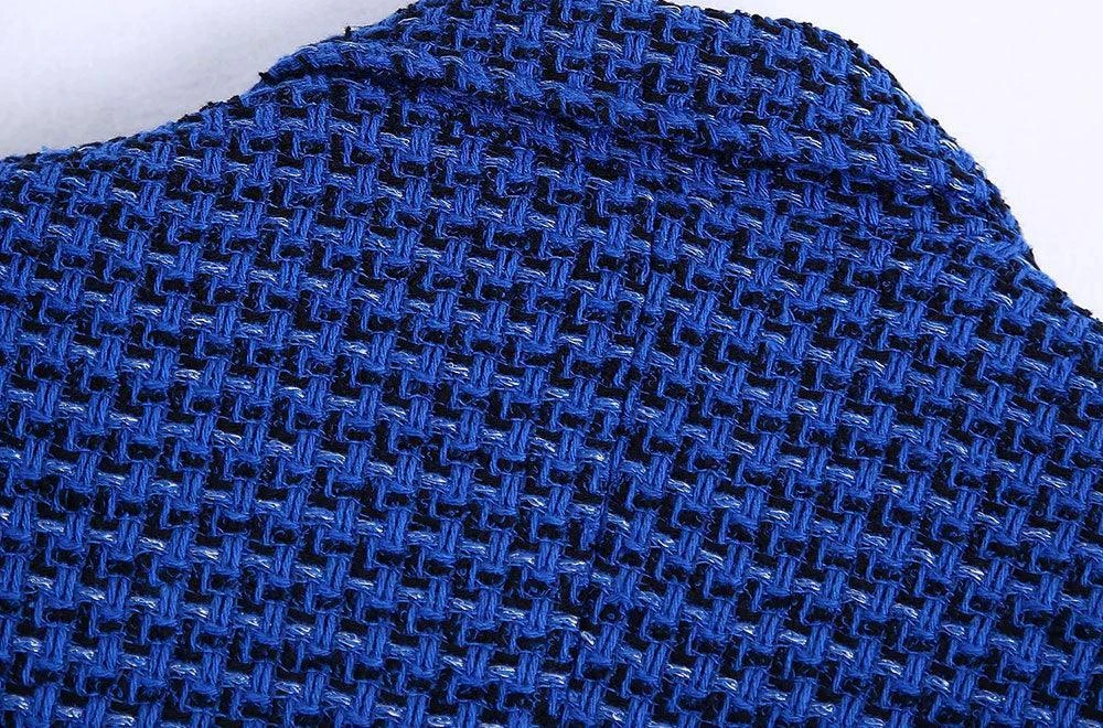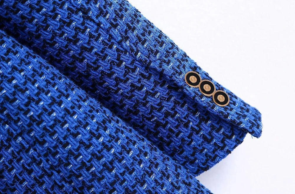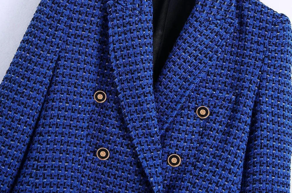 TheDark Blue Tweed Blazer has a classic notch collar and double-breasted design.The notched collar adds to the elegant appearance of this piece. This women’sblazer is made from a soft yet durable woven fabric that has a subtle texture that gives it a vintage feel.Try pairing this with a pair of skinny jeans and a casual top to create an easy and stylish ensemble.