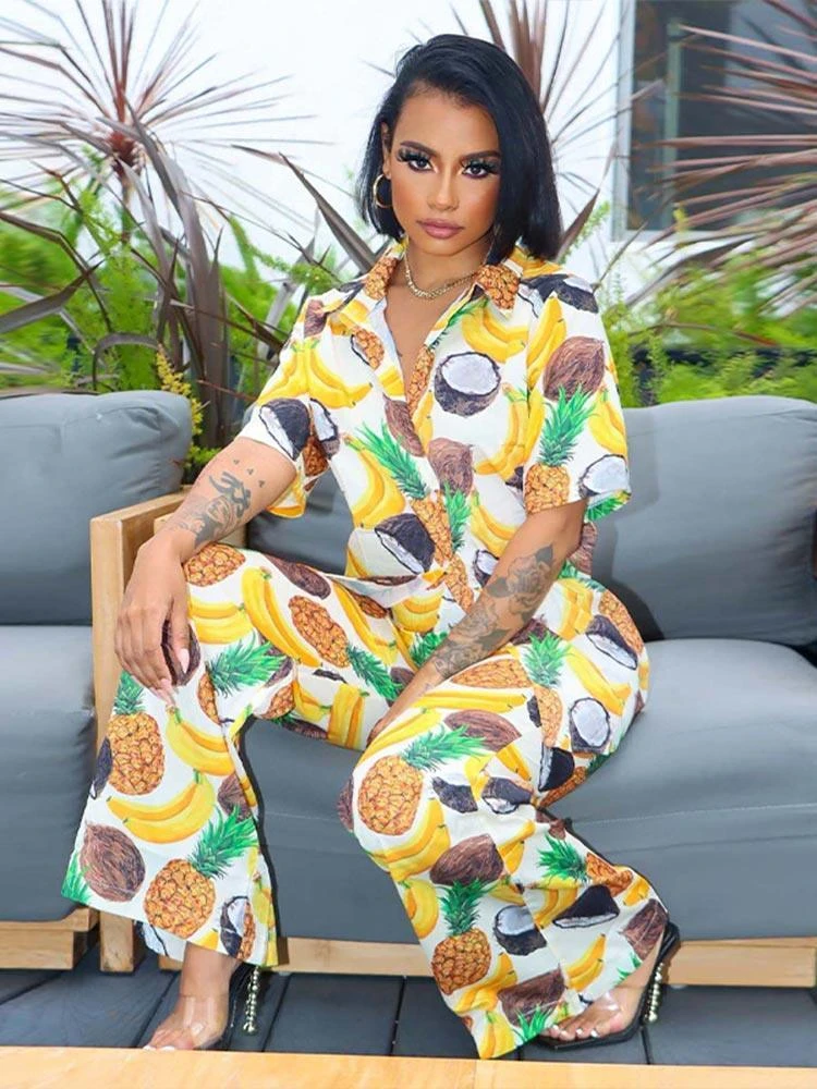 This fruity pantswomen’s outfit set is a modern take on a classic style. Lightweight and comfortable, it’s ideal for the spring and summer seasons.The printed design adds fun to a simple wardrobe and the wide leg cut allows easy movement. The high waist design is flattering and easy to move around, while the wide leg cut has a relaxed but stylish look.