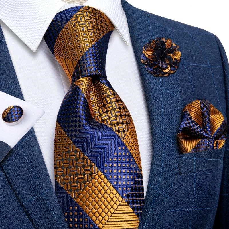 This Gold Blue Striped Silk Necktie Set provides a complete look for men, tailored in a one-size-fits-all silhouette. This fashionable set includes a necktie, handkerchief, and cufflinks made of premium silk material, making it a must-have accessory.