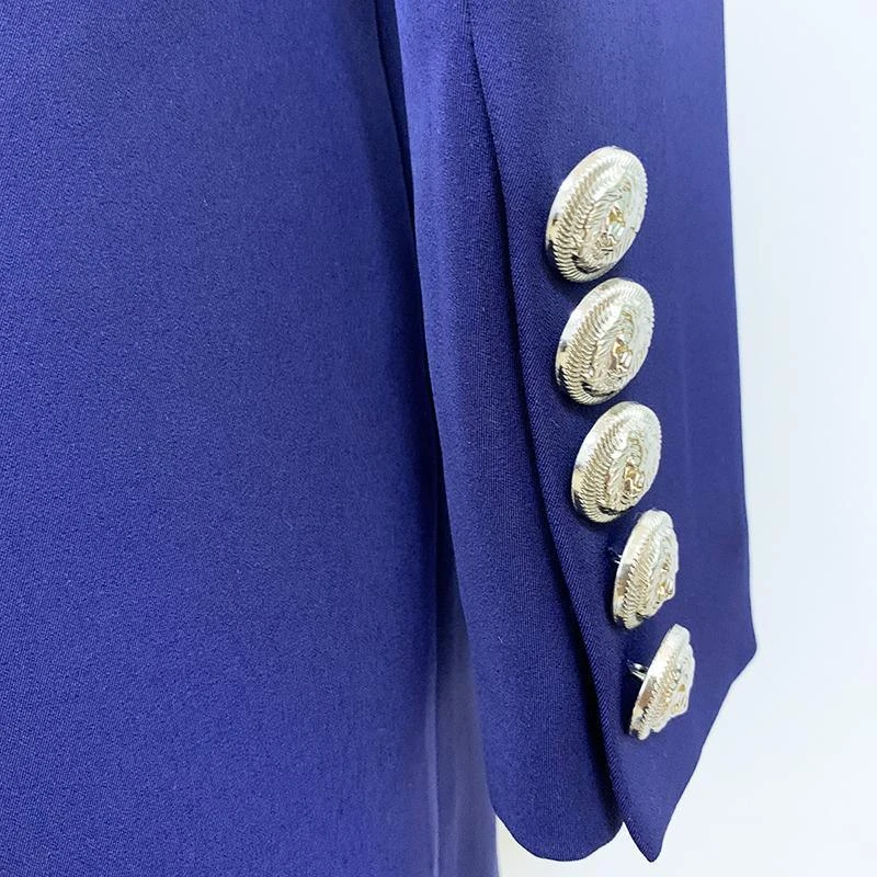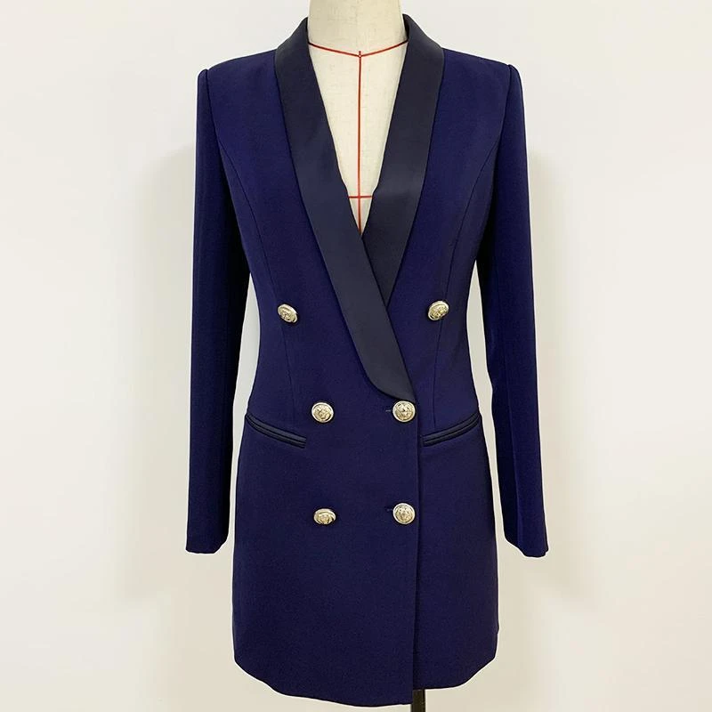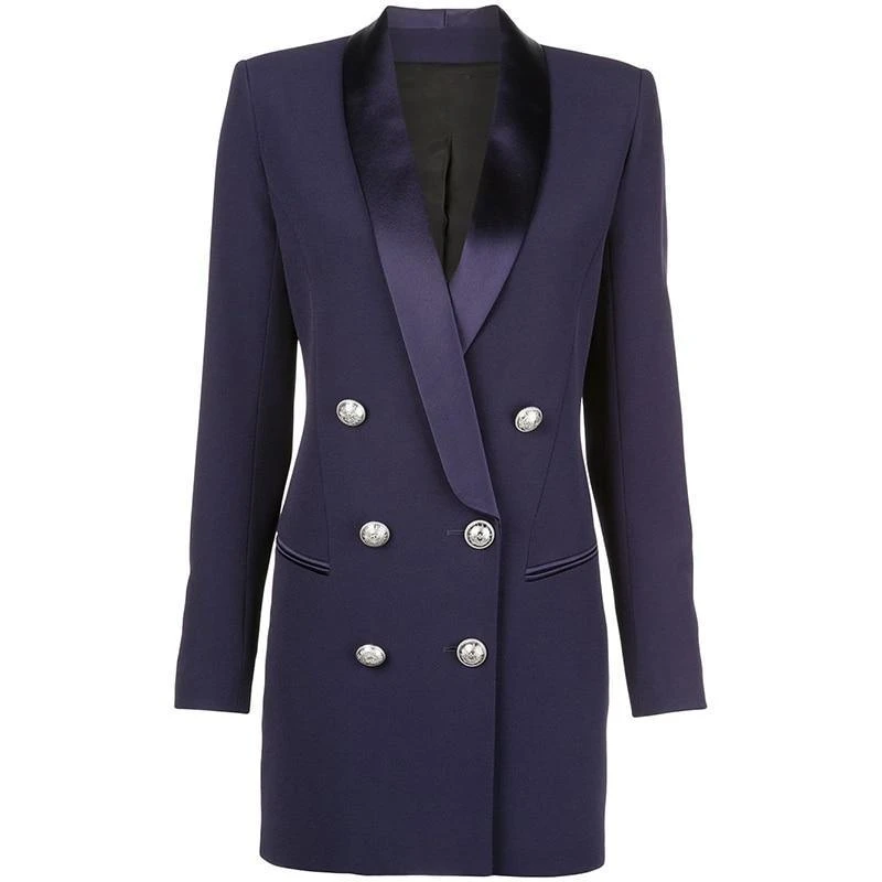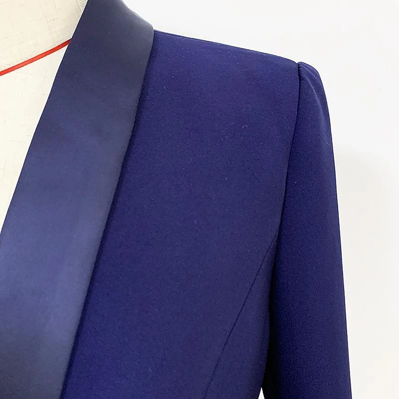 This navy blue tuxedo blazer has a shawl collar design and is a definitive look for women. This tuxedo blazer for women is sure to become a staple feature in any stylish wardrobe with a double-breasted design.