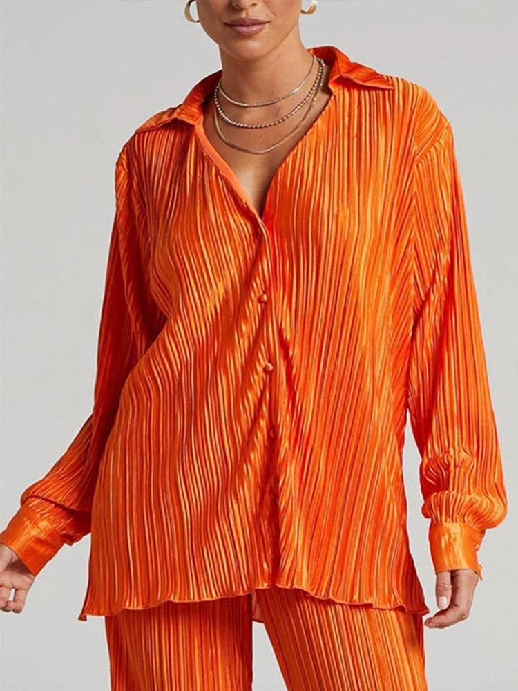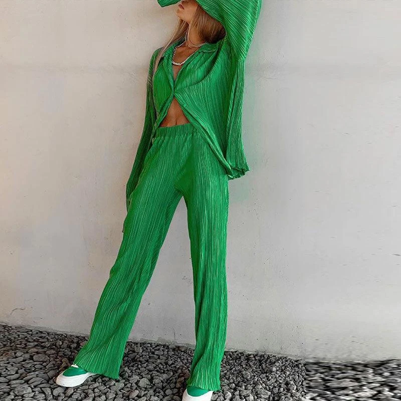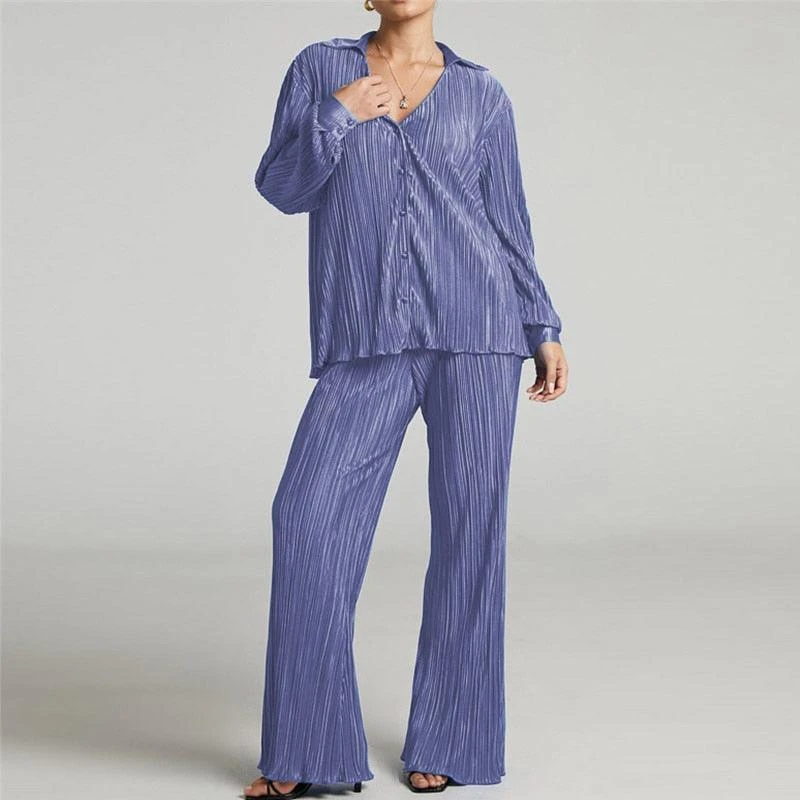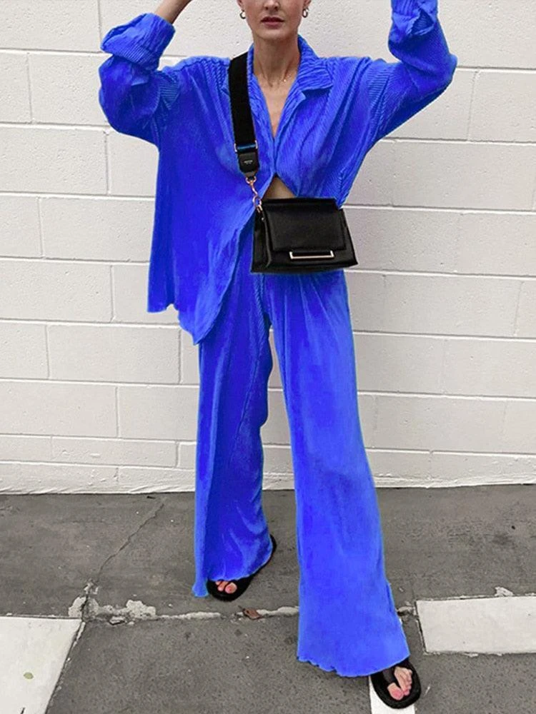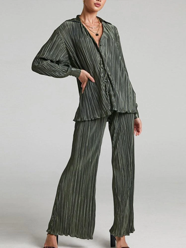 This classic pleated oversizedoutfit set has a classic single-breasted button-down style. Ladies’ shirts that are comfortable and that can be worn all day long. This shirt outfit set comes with flattering, wide-leg pleated pants. This clothing outfit set is perfect for casual occasions.