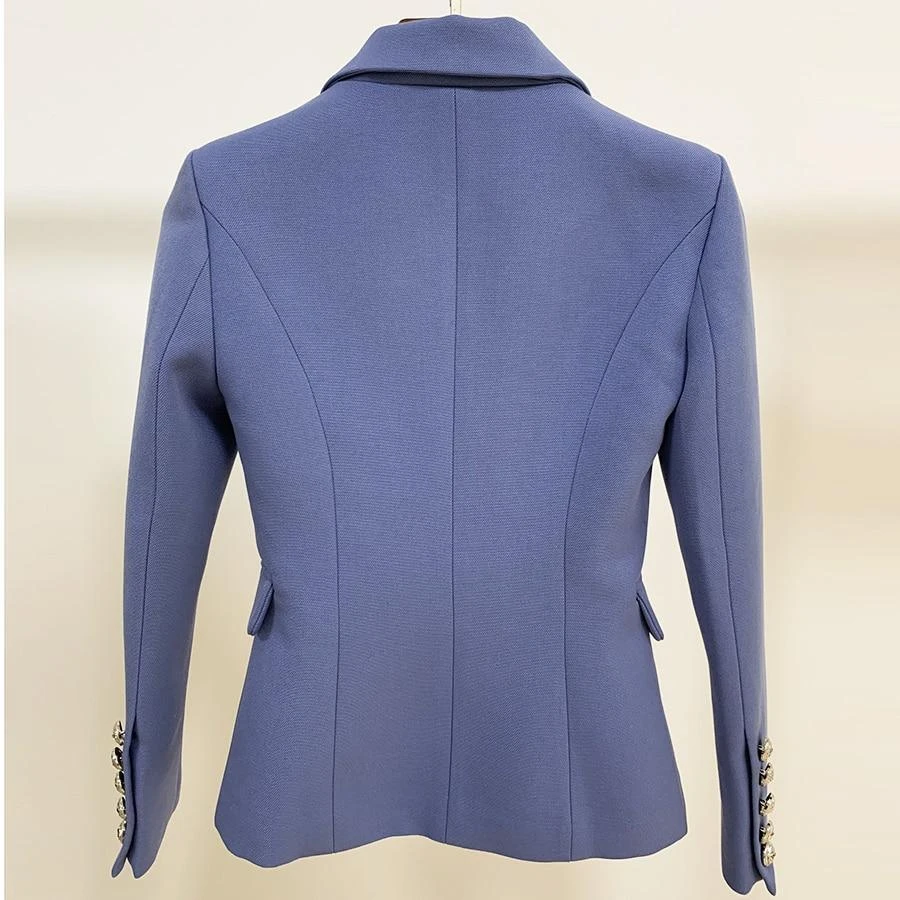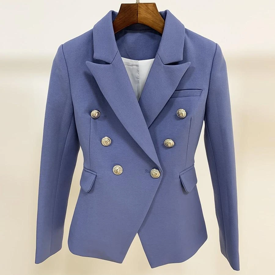 And the solid sky blue color scheme of this stylish double-breasted blazer is sure to go with a variety of outfits. With a double-breasted design, this women’s blazer is sure to become a staple feature in any stylish wardrobe. The cuffs of the long sleeves have a single row of buttons as a decorative element.