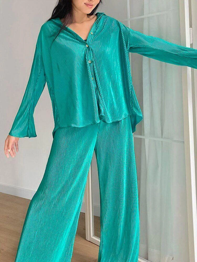 Make a lasting impression this season with these stylish and sophisticated women’s outfit sets. Each piece features a shirt and wide-leg pants. This 2-piece outfit set includes a high waist, flared pants, and a cute pleated shirt.